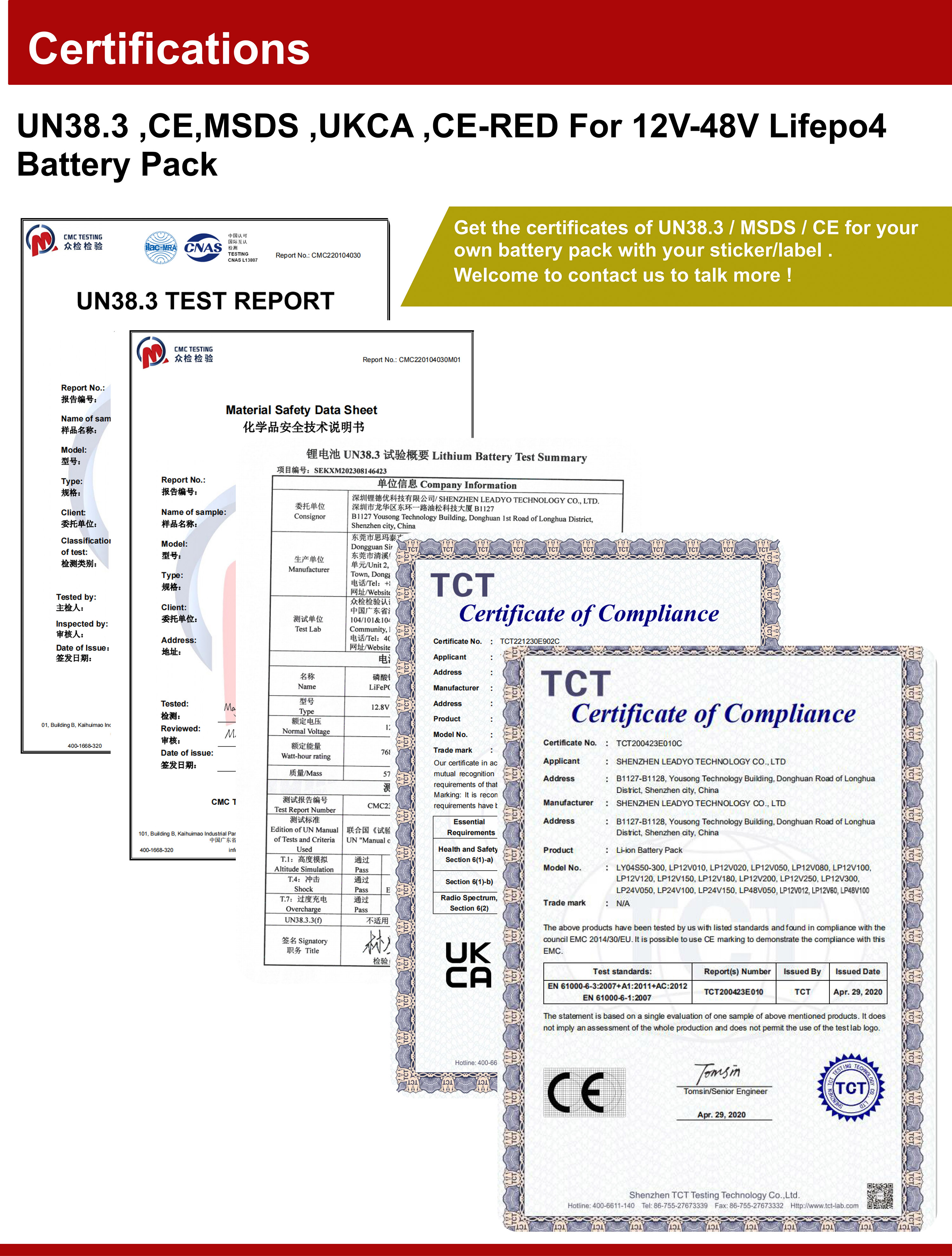 Certifications : UN38.3 ,CE ,MSDS .IEC ,UKCA for whole battery packs .